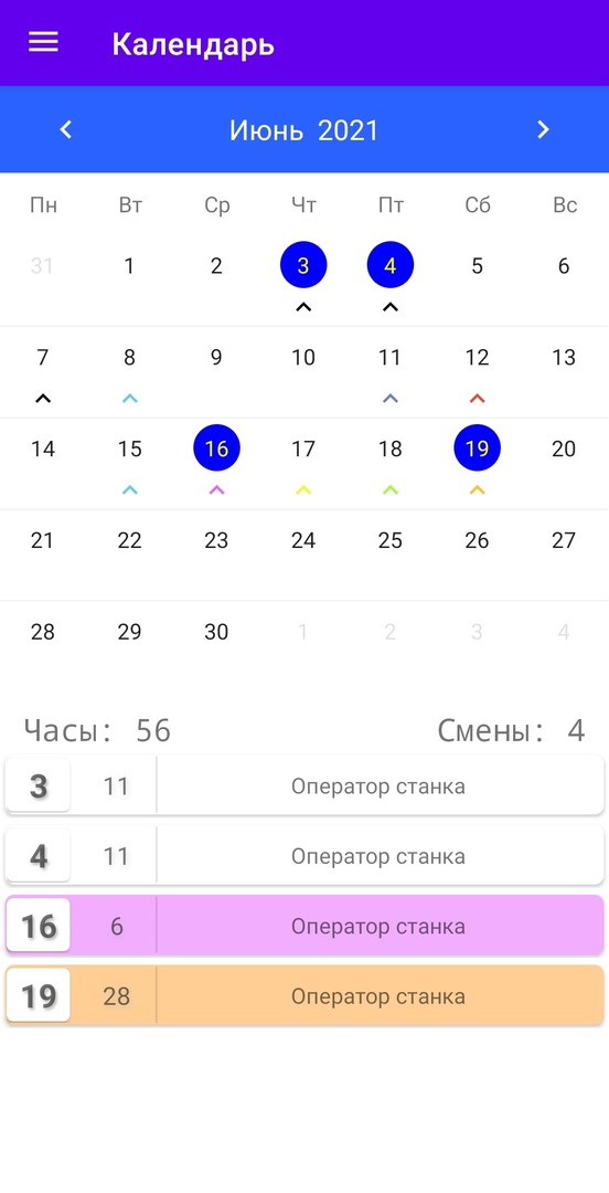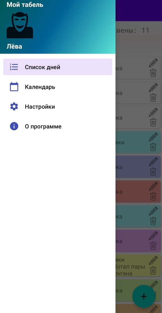 Обновление Мой табель 1.3 ёлки-палки! -Добавлен календарь в программу. Возможности календаря заключается в том, что можно выбирать некоторые дни (по своему желанию), и затем суммируется количество смен и часов. Может кому-то пригодится. Кстати, если в календаре не хватает пару последних дней, просто свайпните по календарю вверх. Он занимает слишком много места на экране, поэтому пришлось его немного подрезать, и не все месяца входят полностью.