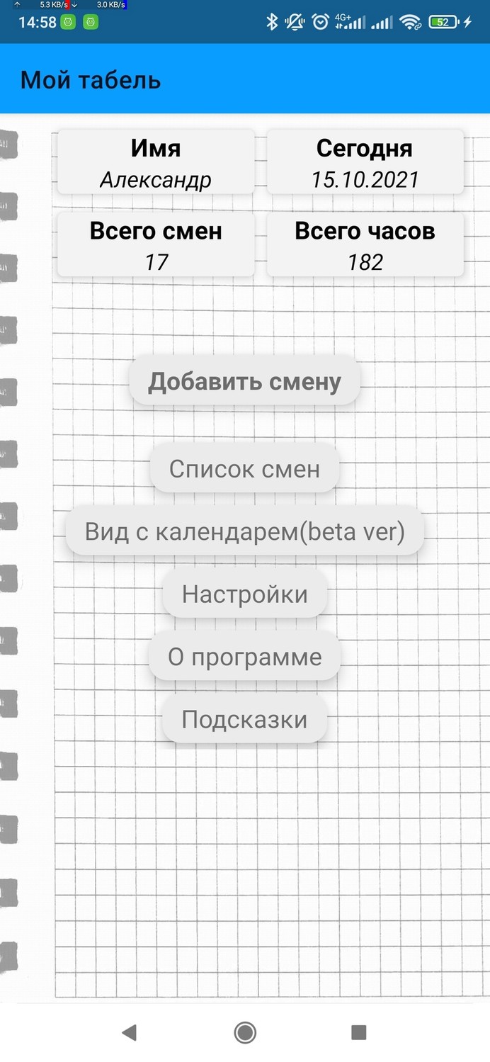 Обновление Мой табель 1.32!!! 1. В этом обновлении, я считаю, появилась правильная навигация по функциям приложения и в ближайшем будущем к этому возвращаться не буду. Приложение должно работать быстрее. Благодаря главному меню, появилось некоторое узнаваемое лицо программы, внешним видом напоминая блокнот или записную книжку. 2. Функции календаря весьма туманны. Да и сам календарь выглядит плохо. Поэтому этот раздел с пометкой бета-версия. 3. Так же, что бы было проще пользоваться программой, был добавлен раздел с подсказками к функциям программы. Главных подсказок там две, другие две сделаны, чтобы заполнить страницу целиком. 4. Известны проблемы с работой внутренней базы данных, на 7% устройств постоянные ошибки. Из-за этого программу на плеймаркете могут заблокировать. Я не знаю что видит пользователь во время ошибок, записываются ли данные, и что в принципе происходит. К следующему обновлению буду организовывать доступ к базе данных плагинами, в связи с чем, очень страшно убить данные пользователей программы своим новым обновлением. 5. Рекламный баннер переехал из списков в главное меню. Находится внизу, не перекрывает интерфейс. В списках дней баннер может вернуться с вероятностью 30%. Всякие неожиданно всплывающие рекламные окна с таймером делать не буду, меня они раздражают, считаю, что раздражают многих. Реклама на весь экран появится в будущем, через специальное меню, по желанию пользователя, он может ее посмотреть. Возможно появятся премиум функции благодаря такой рекламе.